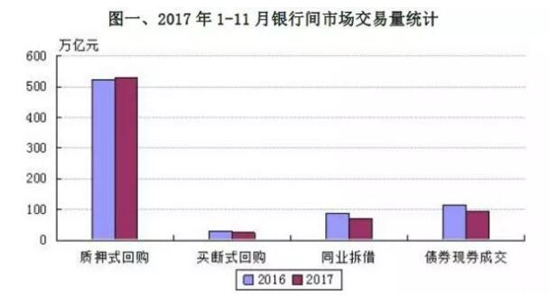 2017年,银行间市场整体运行平稳。货币市场交易量稳中有降,交易利率上行。2017年1-11月,货币市场交易量共计626.41万亿元,同比下降2.27%。其中,质押式回购成交530.56万亿元,同比增长1.62%;买断式回购成交25.18万亿元,同比下降17.43%;同业拆借成交70.68万亿元,同比下降20.03%。从利率水平看,质押式回购加权平均利率为2.9%,同比上行74个基点;买断式回购加权平均利率为3.31%,同比上行79个基点;同业拆借加权平均利率为2.76%,同比上行60个基点。