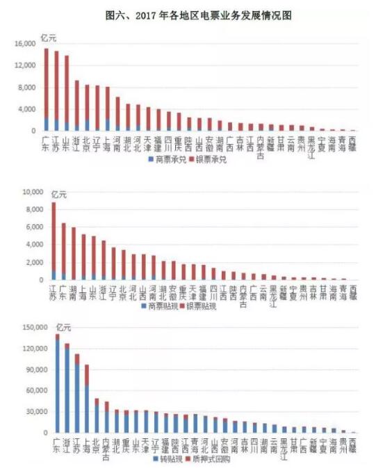 分地区看,2017年,广东、江苏、山东电票承兑业务较为突出,分别占全国总量的11.67%、11.24%和10.64%。贴现业务江苏省最为突出,其次为广东、湖南、上海、山东和浙江。承兑、贴现业务一端连着企业,一端连着金融体系,承兑、贴现业务开展较好,反映了这些地区实体经济的活跃度较高。从交易情况看,广东、浙江、江苏和上海转贴现和质押式回购业务开展较好,四省交易量占全国的46.53%,与该四个地区金融发展程度相对较高密切相关。另外,广东、上海、江苏和北京的商票承兑额最多,反映这些地区的商业信用相对较为发达。
