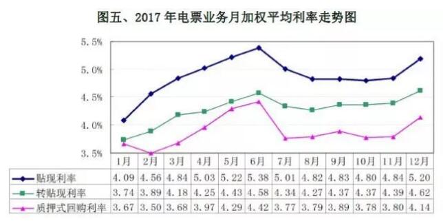 2017年,票据市场利率明显高于上年。全年电票贴现、转贴现和质押式回购加权平均利率分别为4.89%、4.28%和3.85%,分别比上年提升157个、128个和88个基点。与货币市场利率走高趋势一致。
