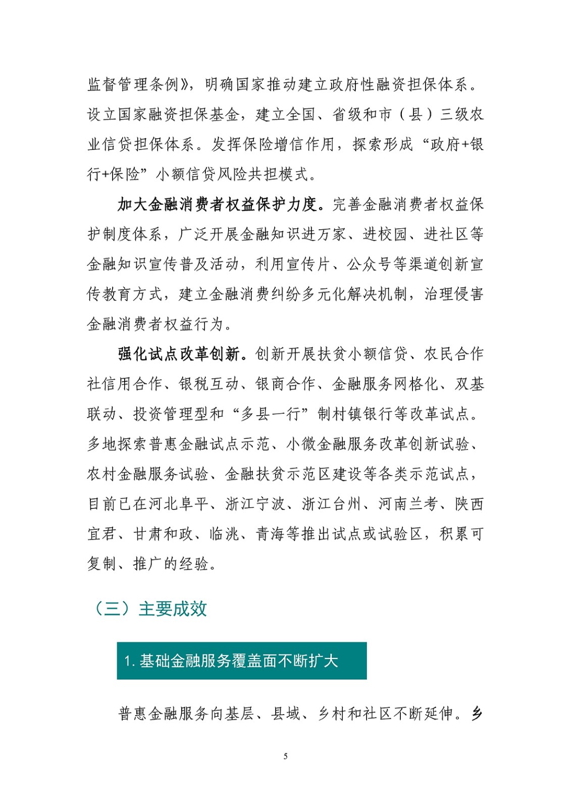 白皮书总结了五年来普惠金融发展的主要成果:基础金融服务覆盖面不断扩大,薄弱领域金融可得性持续提升,金融服务的效率和质量明显提高,金融扶贫攻坚成效卓著,金融基础设施和外部环境逐渐改善。这些成果的取得,依赖于政府部门和市场主体采取的一系列措施:深化体制改革,发展多层次的普惠金融供给;健全工作机制,构建普惠金融市场化经营模式;聚焦薄弱领域,创新普惠金融产品服务;运用科技手段,发展数字普惠金融;强化激励约束,完善普惠金融政策措施;推进基础设施建设,改善普惠金融发展环境;加强金融知识宣传普及,保护金融消费者合法权益;开展试点示范,探索地方普惠金融发展模式,探索可持续、可复制的普惠金融发展经验。