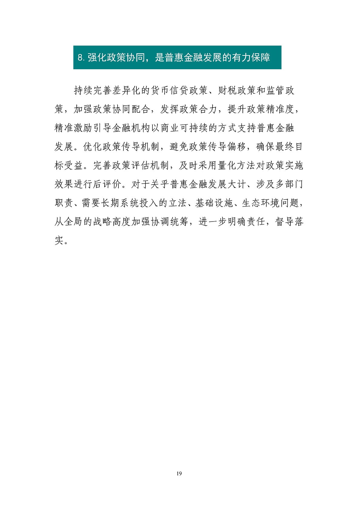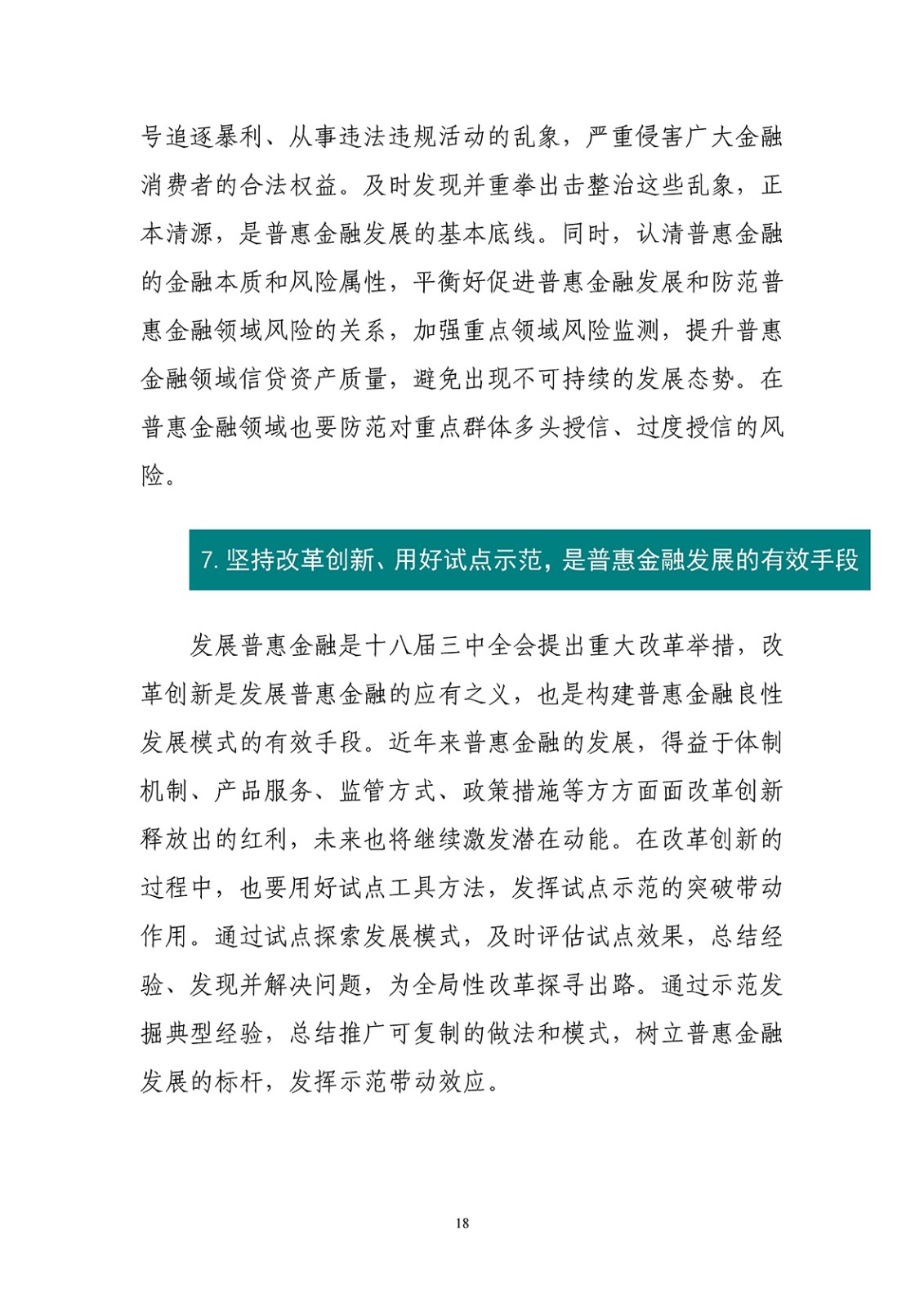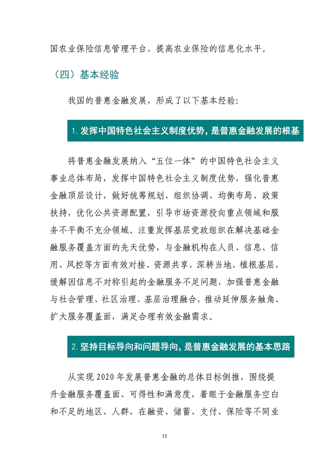 白皮书梳理了我国普惠金融发展形成的经验:发挥中国特色社会主义制度优势,是普惠金融发展的根基;坚持目标导向和问题导向,是普惠金融发展的基本思路;发挥市场主导作用,是普惠金融发展的根本动力;数字普惠金融引领,是普惠金融可持续发展的重要出路;全面推进、突出重点,是普惠金融发展的基本方法;遏制乱象、防范风险,是普惠金融发展的基本底线;坚持改革创新、用好试点示范,是普惠金融发展的有效手段;强化政策协同,是普惠金融发展的有力保障。