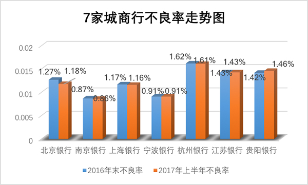根据银监会数据,2017年第二季度,全国城商行不良贷款率为1.51%,低于大型国有银行、全国股份制银行、农商行的不良贷款率,同比上升0.02个百分点,环比一季度末上升0.01个百分点,增速亦明显放缓。