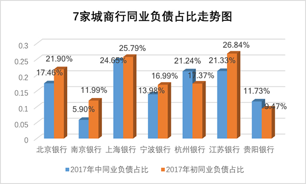 监管部门的整治效果从银行半年报数据中可见一斑。从7家上市城商行的同业负债情况来看,2017年上半年整体呈现下降趋势。其中,北京银行、南京银行、上海银行、宁波银行、江苏银行的同业负债率分别为17.46%、5.90%、24.65%、13.98%、21.33%、11.73%,比年初下降了4.44%、6.09%、1.14%、3.01%、5.51%。