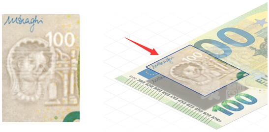 对光观察,可见多色调水印“欧罗巴”头像与建筑和白水印“100”面额数字。