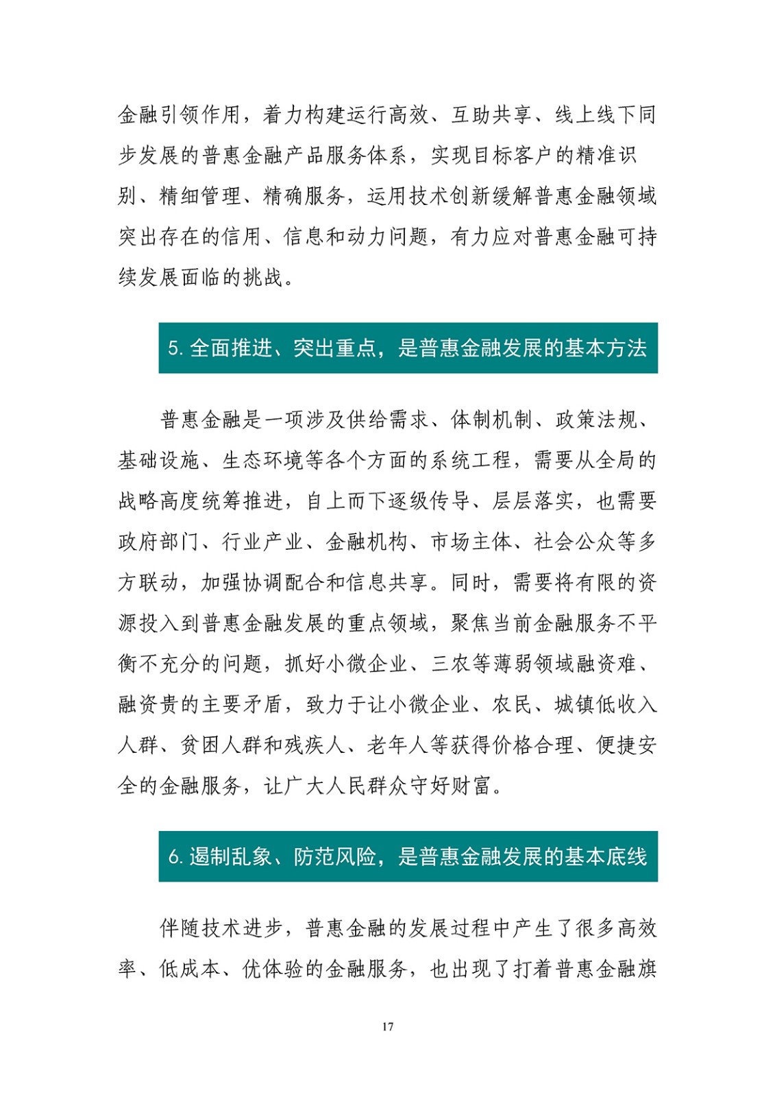 白皮书梳理了我国普惠金融发展形成的经验:发挥中国特色社会主义制度优势,是普惠金融发展的根基;坚持目标导向和问题导向,是普惠金融发展的基本思路;发挥市场主导作用,是普惠金融发展的根本动力;数字普惠金融引领,是普惠金融可持续发展的重要出路;全面推进、突出重点,是普惠金融发展的基本方法;遏制乱象、防范风险,是普惠金融发展的基本底线;坚持改革创新、用好试点示范,是普惠金融发展的有效手段;强化政策协同,是普惠金融发展的有力保障。