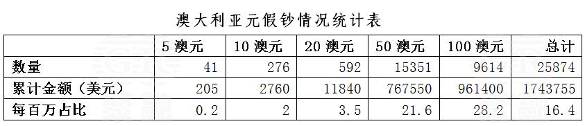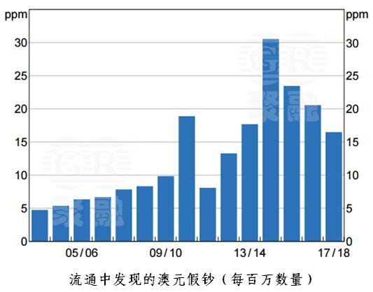 在2017-2018年,在流通中发现的澳大利亚元假钞数量大约为26000张,累计金额将近200万美元,相当于每百万流通真钞中可检测到大约16张假钞,该数据相比2016-2017年下降20%。