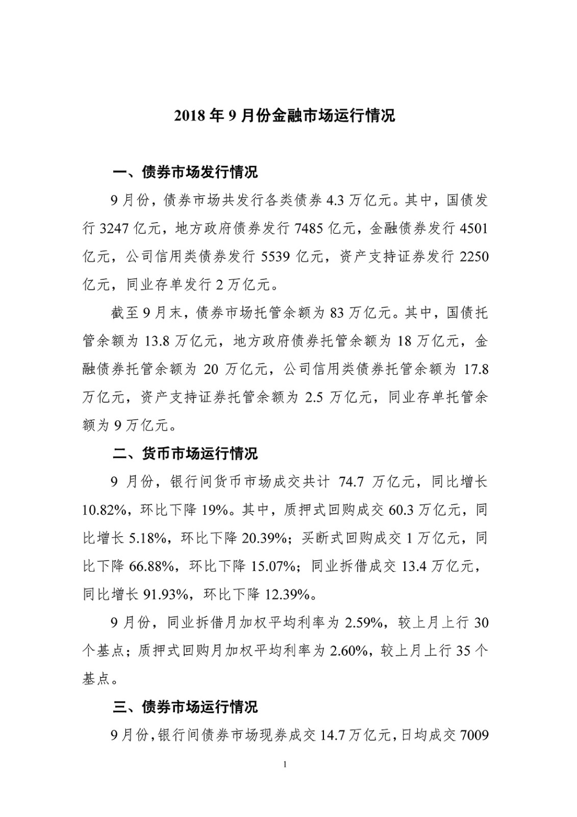 2018年9月份金融市场运行情况